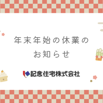 2025/12/23 年末年始の休業日について 記念住宅株式会社は下記の期間を年末年始休業とさせていただきます。 記念住宅事務所 2025年12月27日(土)~2026年1月4日(日) この期間中にいただいたお問い合わせにつきま... 続きを読む