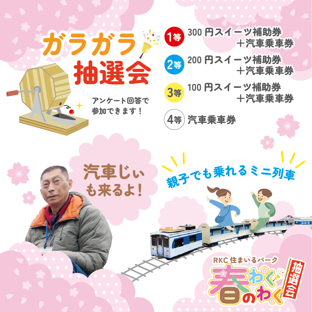 ガラガラ抽選会をきっかけに、スイーツマルシェや汽車じいのミニ列車へと足を運んでいただき、会場全体をゆったりと回遊していただけるのが今回の魅力です。住まいるパークで、春の心地よいひとときをぜひお過ごしください。