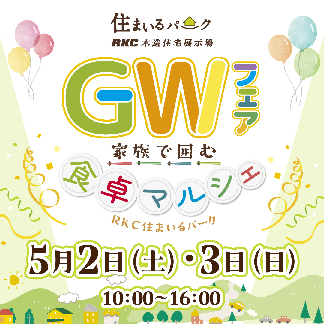 RKC住まいるパーク展示場では、5月2日(土)・5月3日(日)の2日間 GWフェア『家族で囲む食卓マルシェ』を開催します。