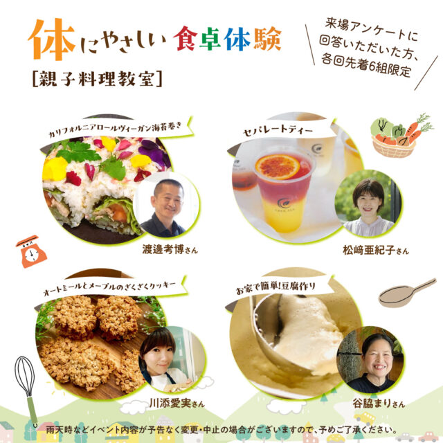 親子で参加できる料理教室が開催されます。ヘルシーなヴィーガン海苔巻きや、豆乳から作る手作り豆腐、見た目も美しいセパレートティーなど、身体にもやさしく、心も満たされる内容が用意されています。
