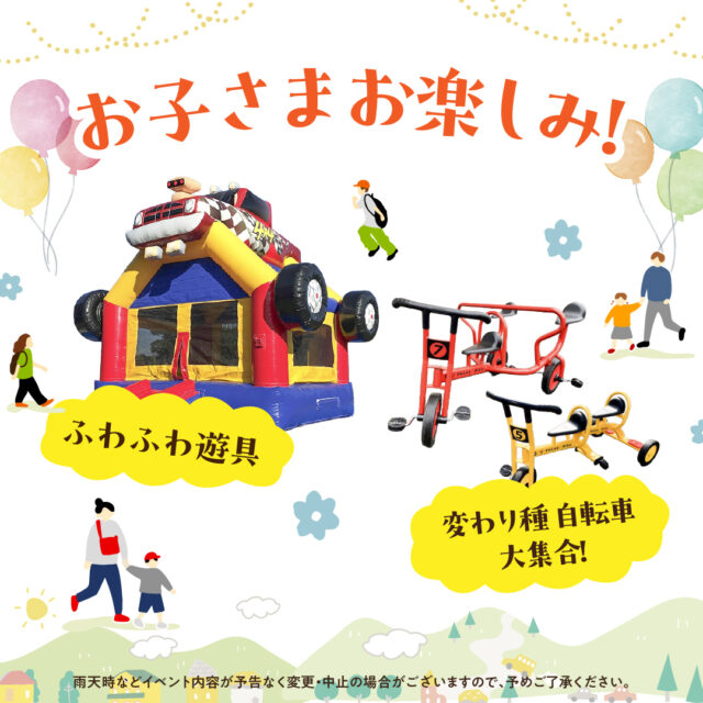 会場には、子どもたちが思いきり楽しめる遊具も登場します。普段なかなか体験できないユニークな自転車や、ふわふわ遊具など、自然と笑顔があふれる工夫がいっぱいです。