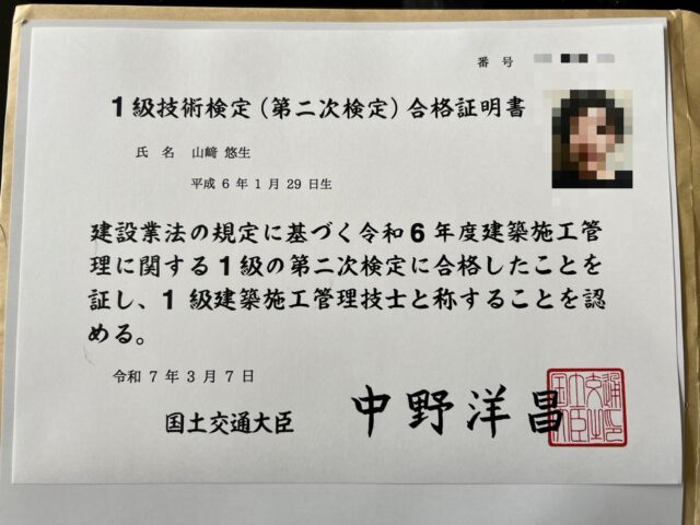 一級建築施工管理技士取得!! ホーム > スタッフブログ > 一級建築施工管理技士取得!! こんにちは、工務課の山﨑です! 季節の変わり目で、体調を崩しやすくなっておりますが山﨑は毎日現場に行っております!皆様は、元気にお過ごしでしょうか? そして、私事ではございますが、 1月になんと!一級建築施工管理技士の合格発表があり合格することができました!そして、先日合格証明書が届きました! まだ、資格を取得しただけなので慢心することなく、新しいことにチャレンジしていきたいと思います! 次は2級建築士・・・。 おわり
