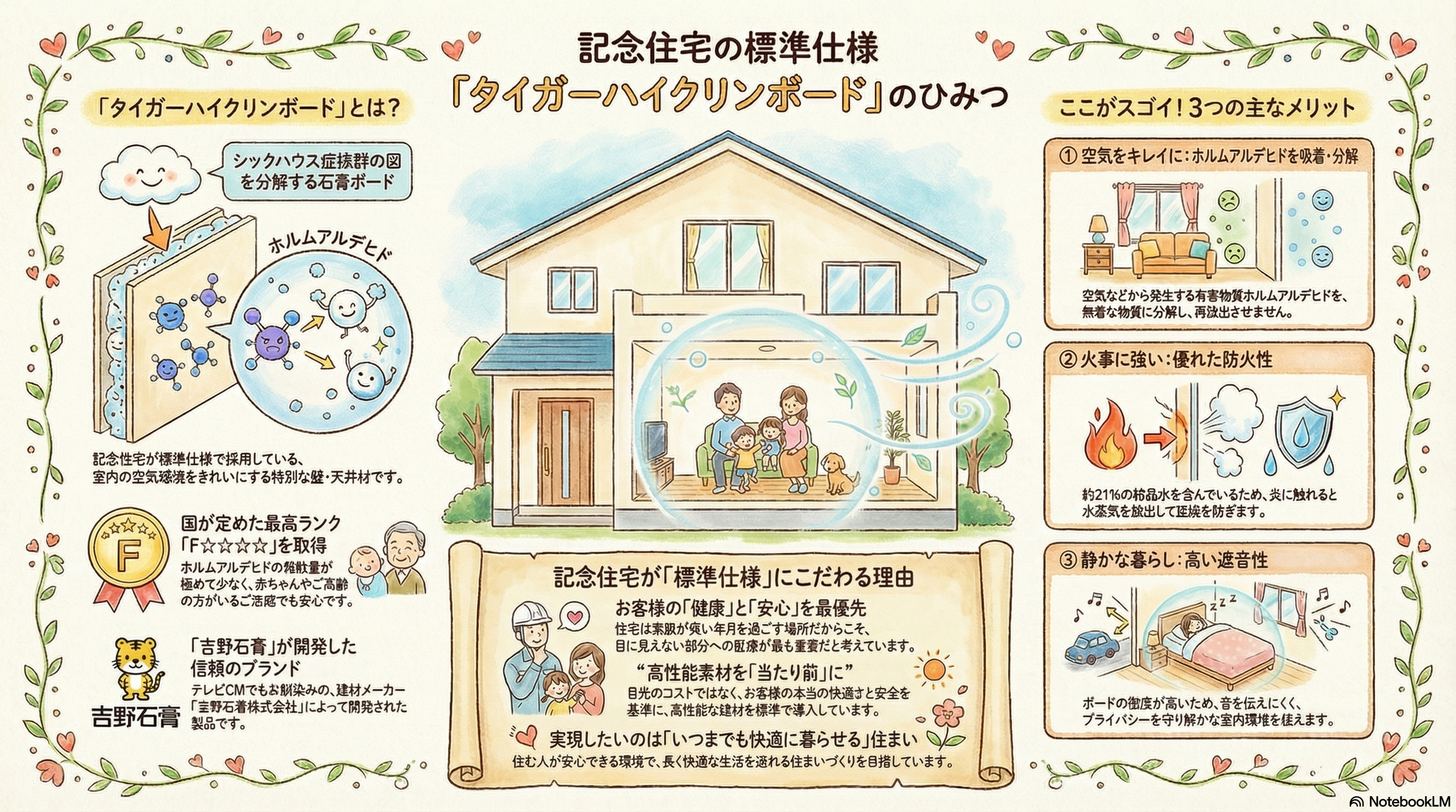 数ある建材の中から、記念住宅がタイガーハイクリンボードを標準仕様に選んでいるのは、お客様の健康と安心を最優先に考えているからです。