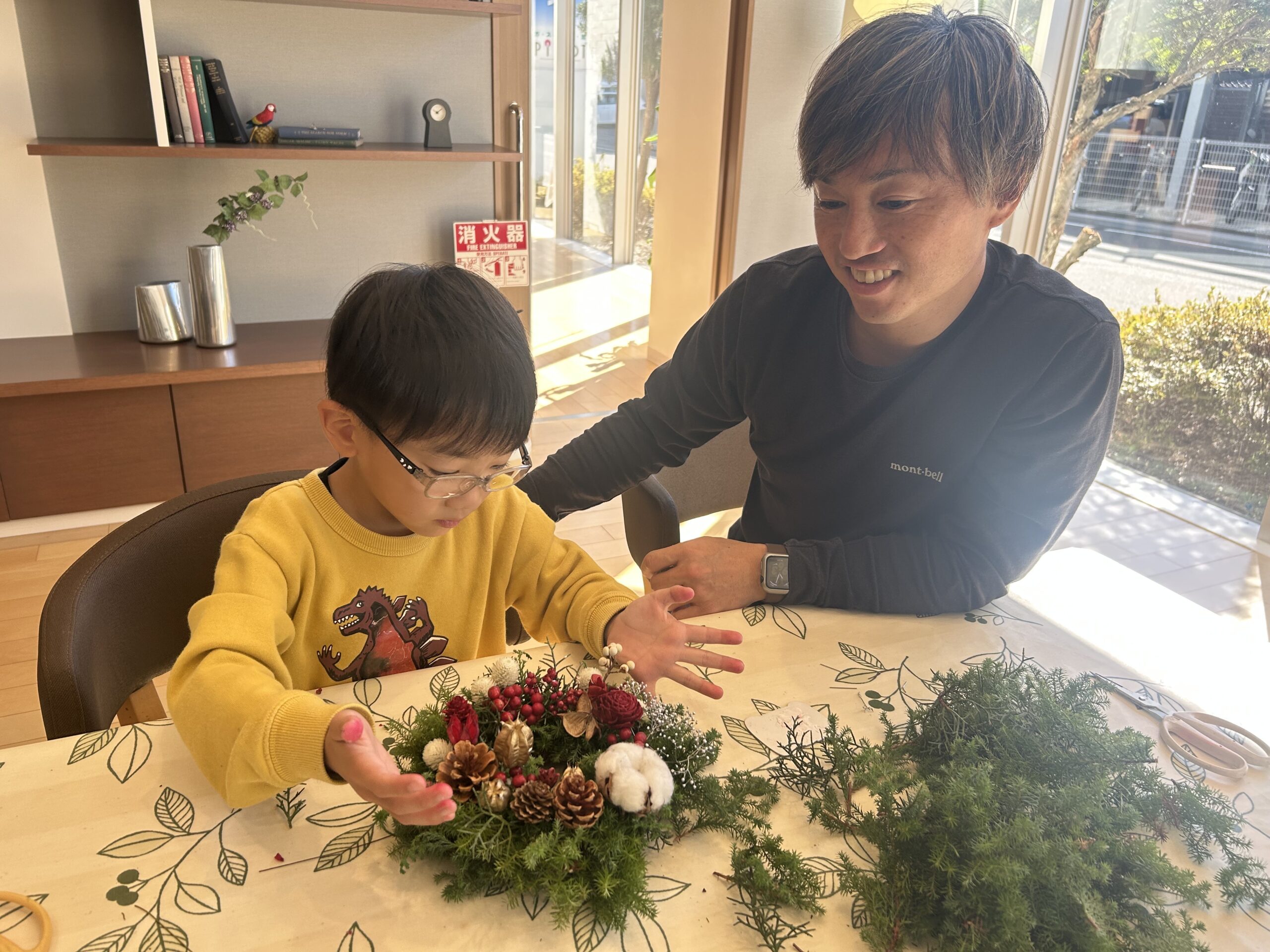 お花屋さんのソトさんにもご協力いただき、四季の素材を使ったオリジナルリース作りに挑戦していただきました。