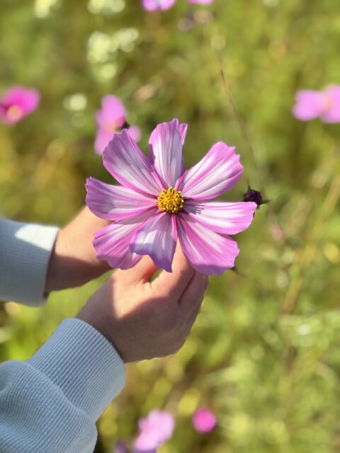 二色がキレイに混ざったコスモス。ピンク大好き娘が写真を撮りやすい様にアシストしてくれました。