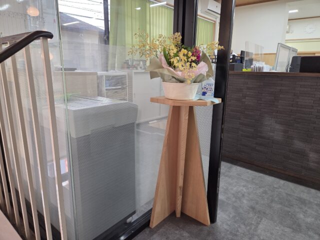 事務所の入口に置かせていただきました。ぱっと華やかな色合いのお花が目に入ってきて、社員みんな癒されています。