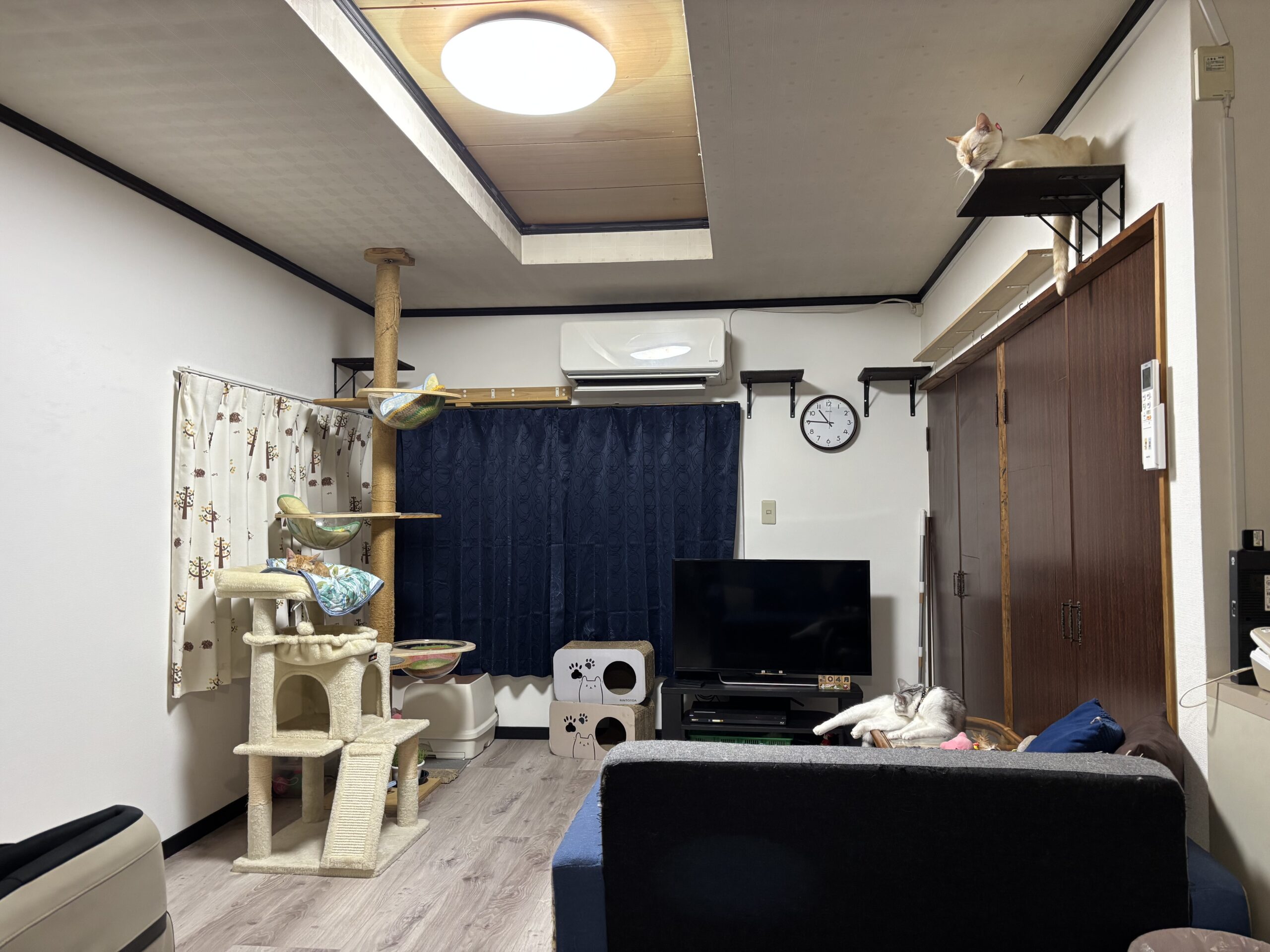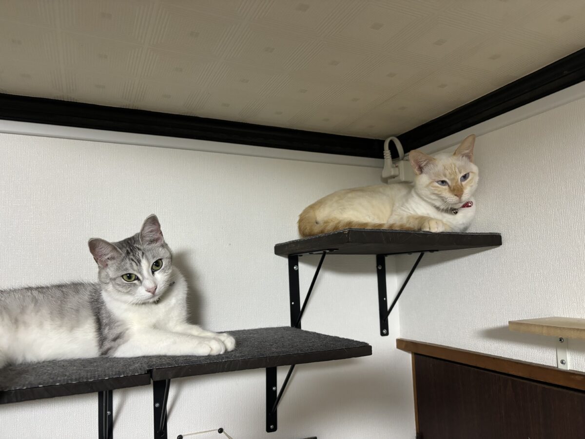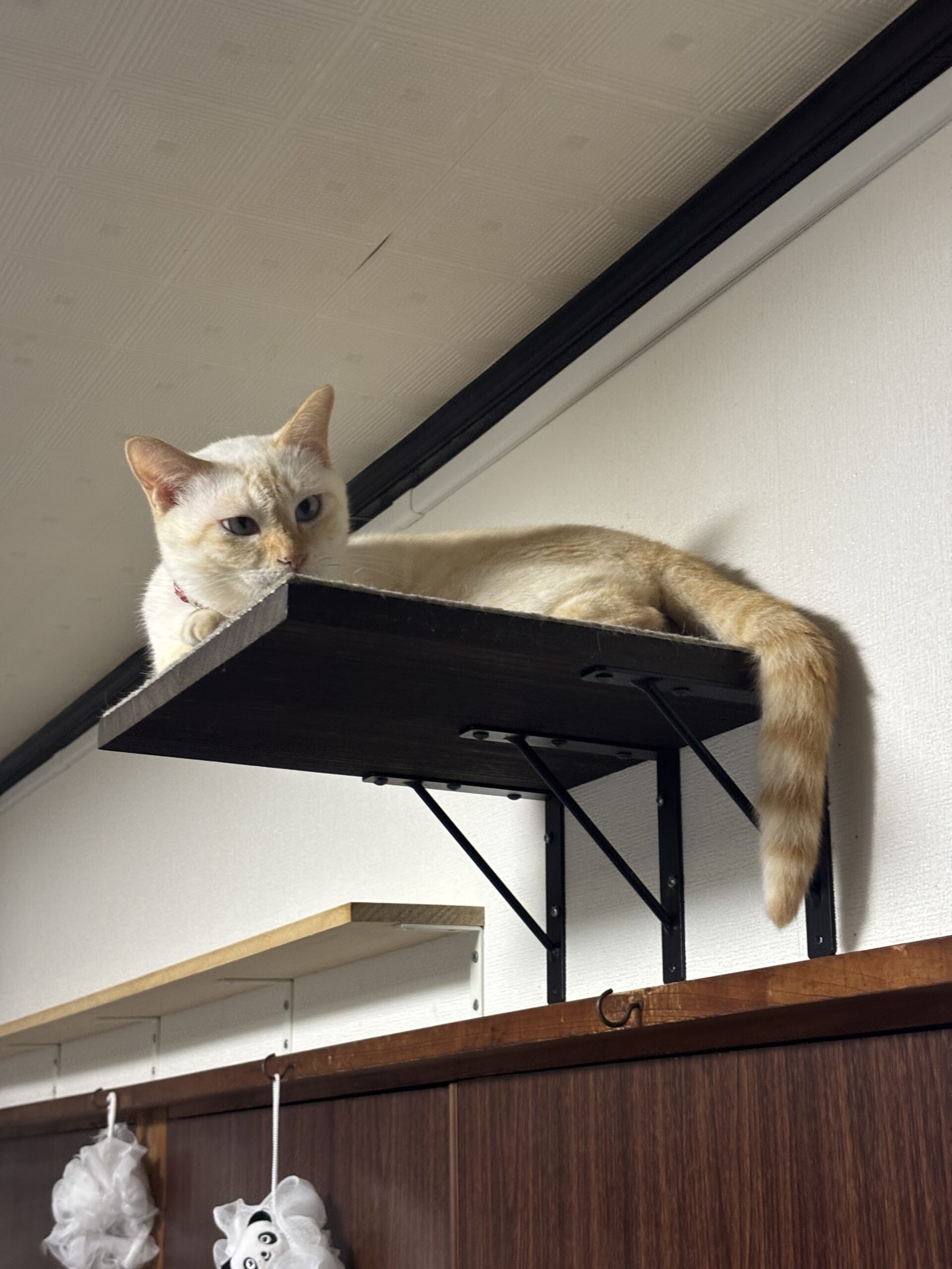 猫用DIY ホーム > スタッフブログ > 猫用DIY 工務課の溝渕です! 溝渕家では猫を3匹飼っているのですが家にはゲージは置かずオープンな状態にしています。 あらゆる部屋を行ったり来たりしますが3匹共通して好きなところがあります。 それは高いところです。 タンス、本棚、食器棚の上等々あらゆる場所が猫の遊び場・寝場所になります。 猫の為に高い場所の物を除け掃除をし…猫を飼い始めると高いところが綺麗になっていきます。 そこでいっそのこと高い場所を作ってあげました。 ホームセンターで板と棚受けを購入しDIYで取り付けました。 気に入って寝てくれるので作って良かったなぁと思う今日この頃です。