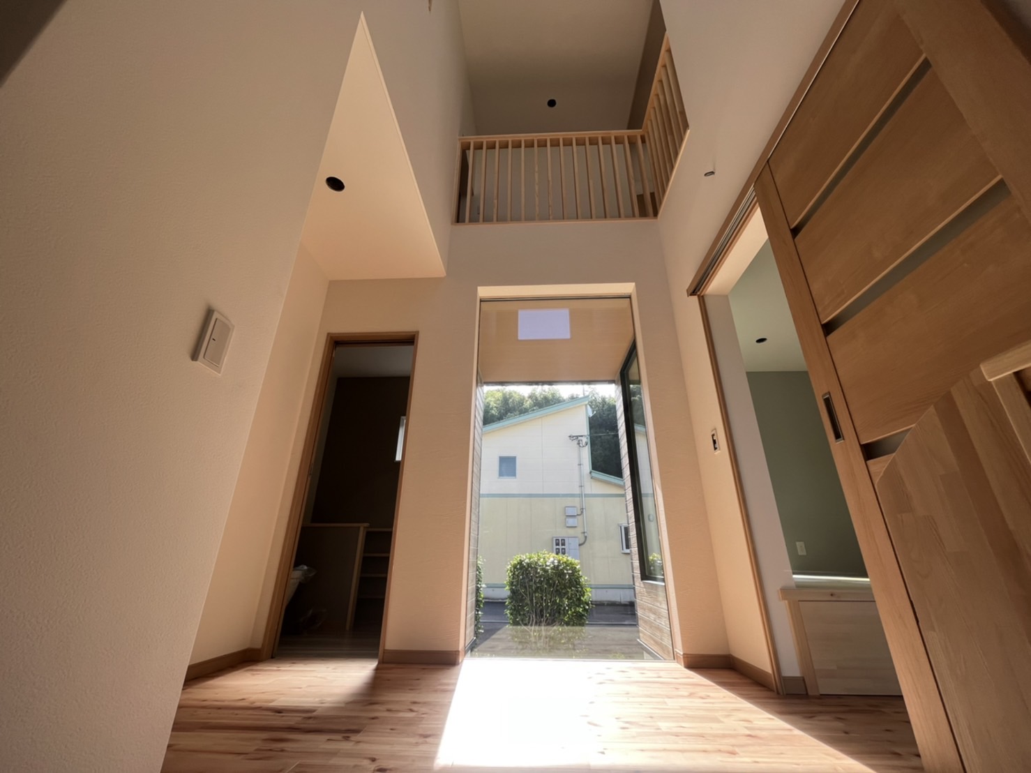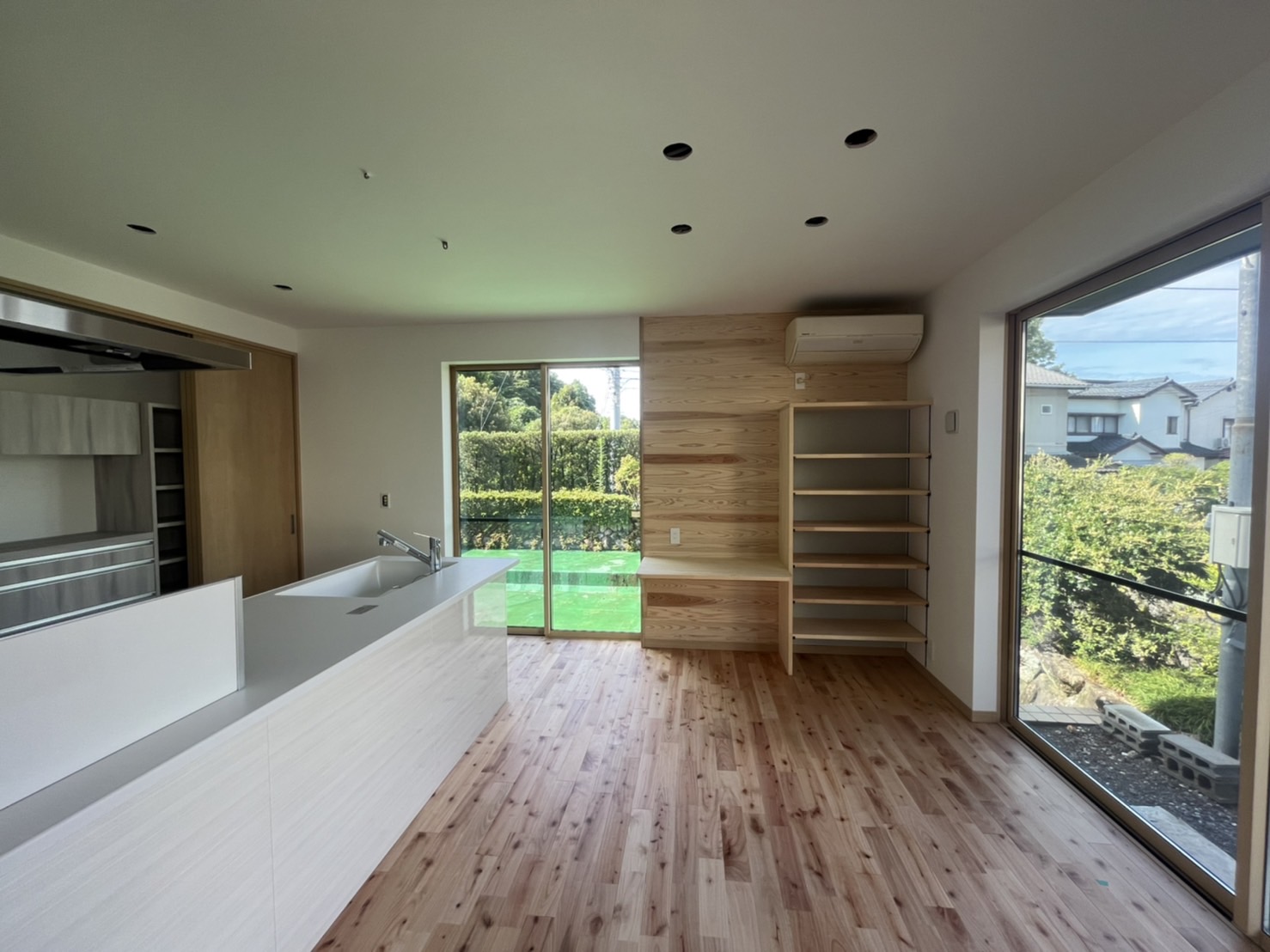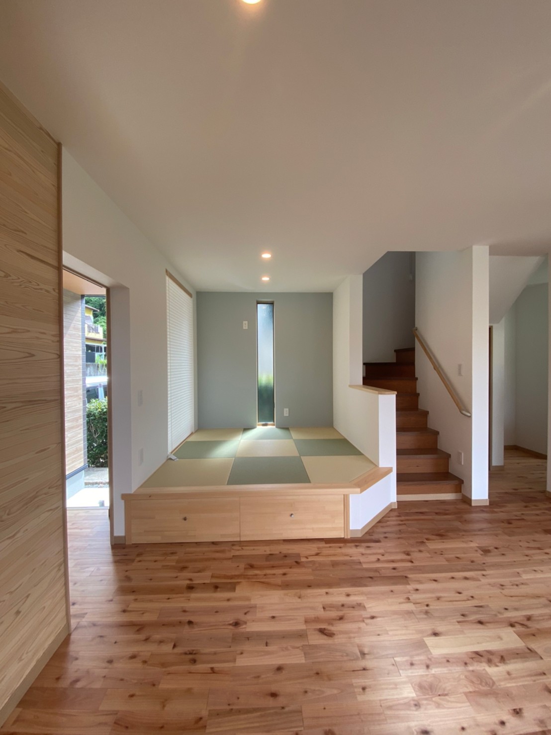 シンプルな木の家。風通しや吹き抜け・広々開放感のあるリビング。地形を生かし、地元の気候に馴染んだ木材・素材を使用する。杉の香りに包み込まれたリビングと、隣接する小上がりの和室から眺める中庭。これからのT様の暮らしがより豊かになりますように。