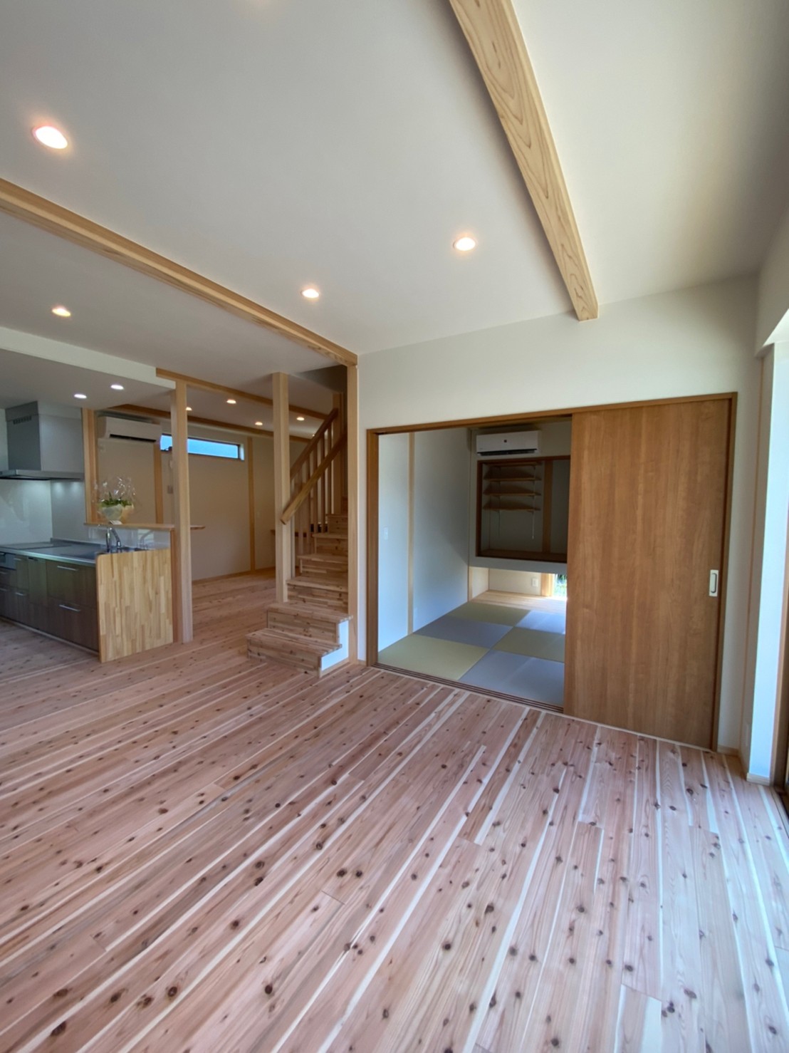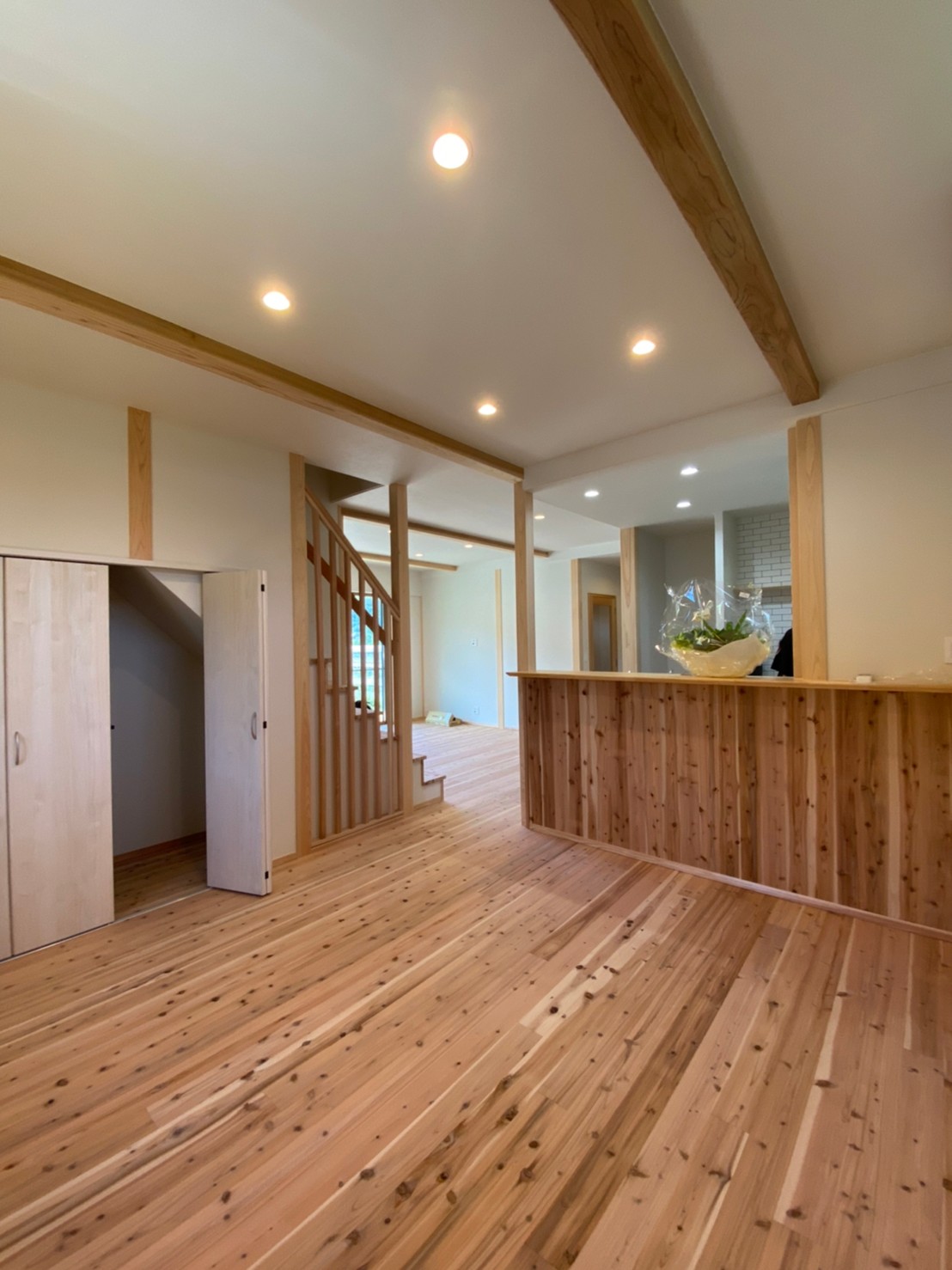 見出しの梁や高知県産材の杉を用いた床など、木の温かみを感じ、ご家族でリラックスして過ごすことのできるお家が完成しました。