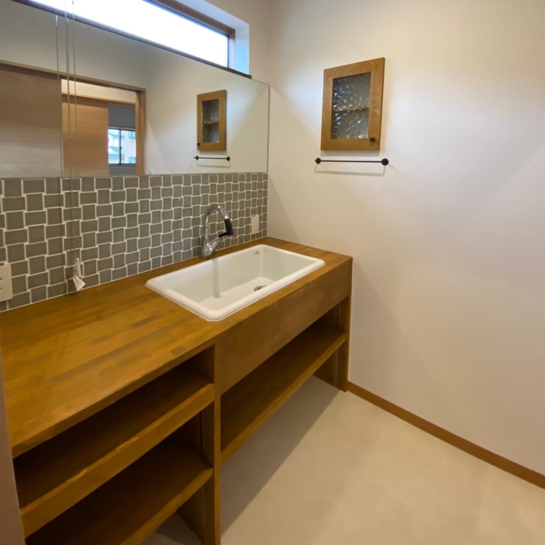 こだわったところは、大きな鏡と洗面ボウルの洗面台と軒の長さ。