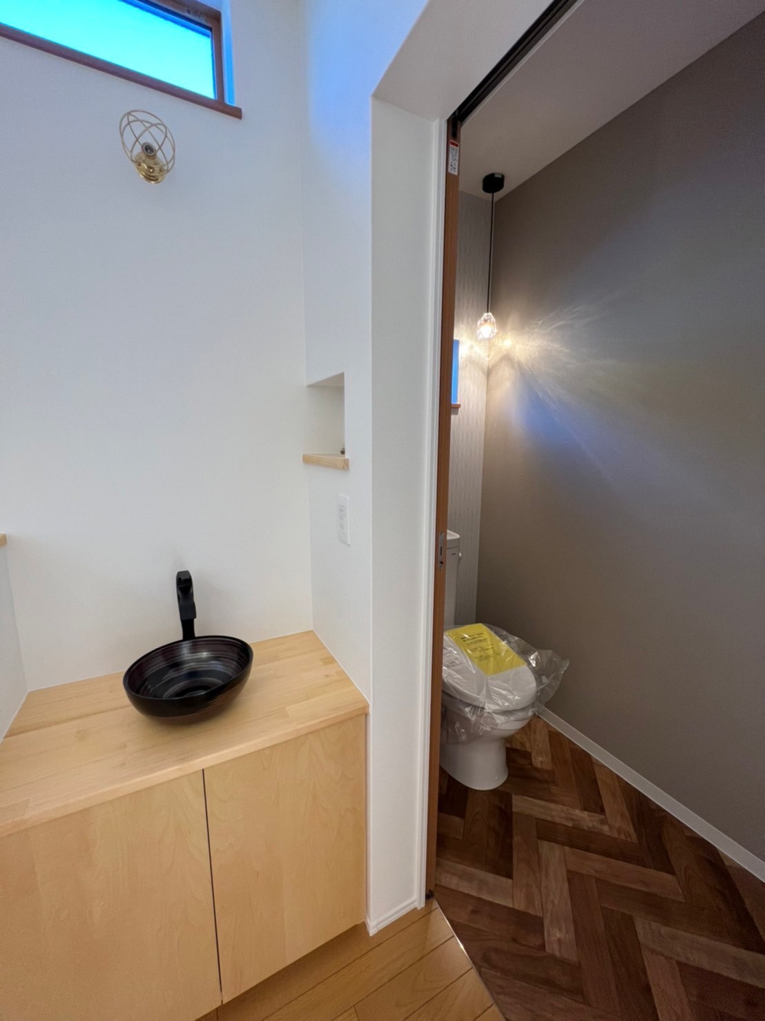 トイレは、クロスや床、ライトまでセレクトされたおしゃれな空間に。