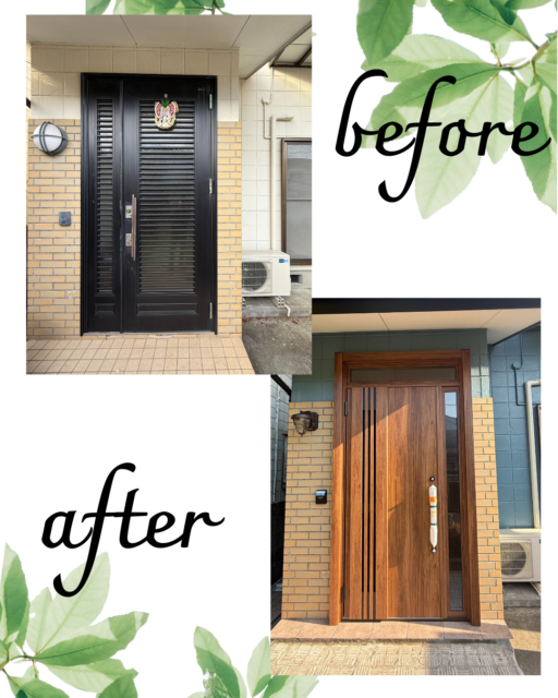 今回は、もともと黒い玄関扉だったものを、あたたかみのある木目調デザインへリフォームしました。