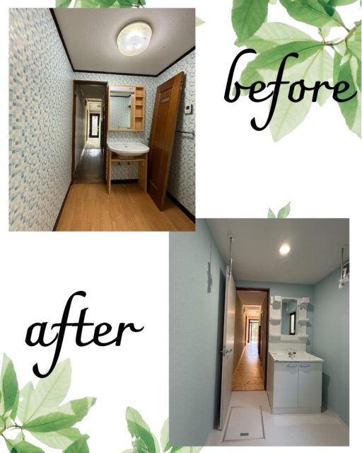 今回のリフォームではアクセントに、青のくすみカラーの壁紙を採用。落ち着きのある色味が、毎日の身支度の時間を穏やかにしてくれます。