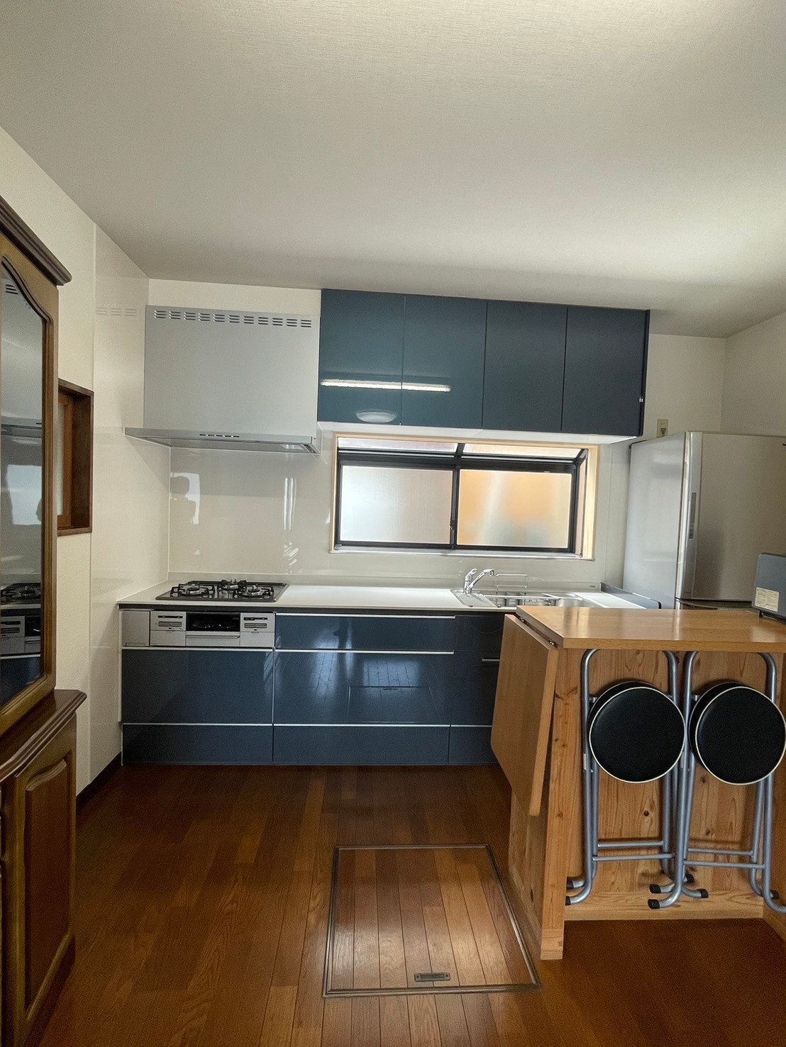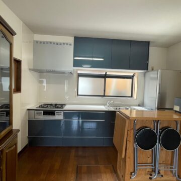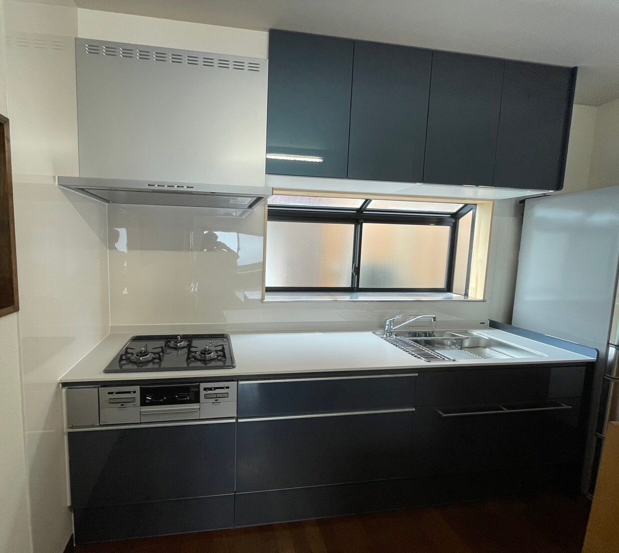 リフォーム後のキッチンは、深みのある紺色を基調とした上品な印象に仕上げました。