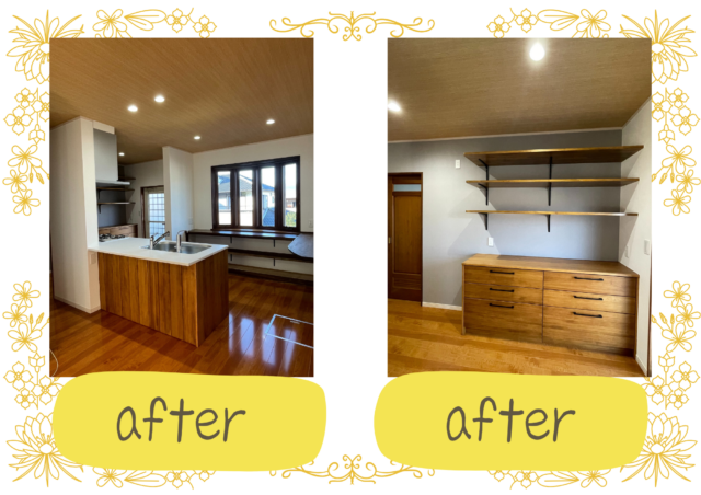 リフォーム後は、大きく向きを変えてキッチンをリビング側へ変更して、壁を全部のけたのでより開放的な空間になっています。