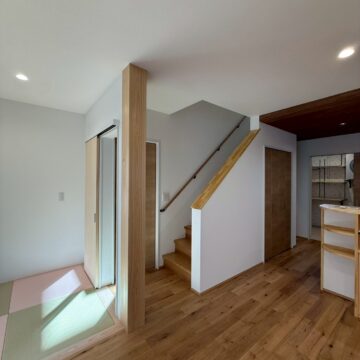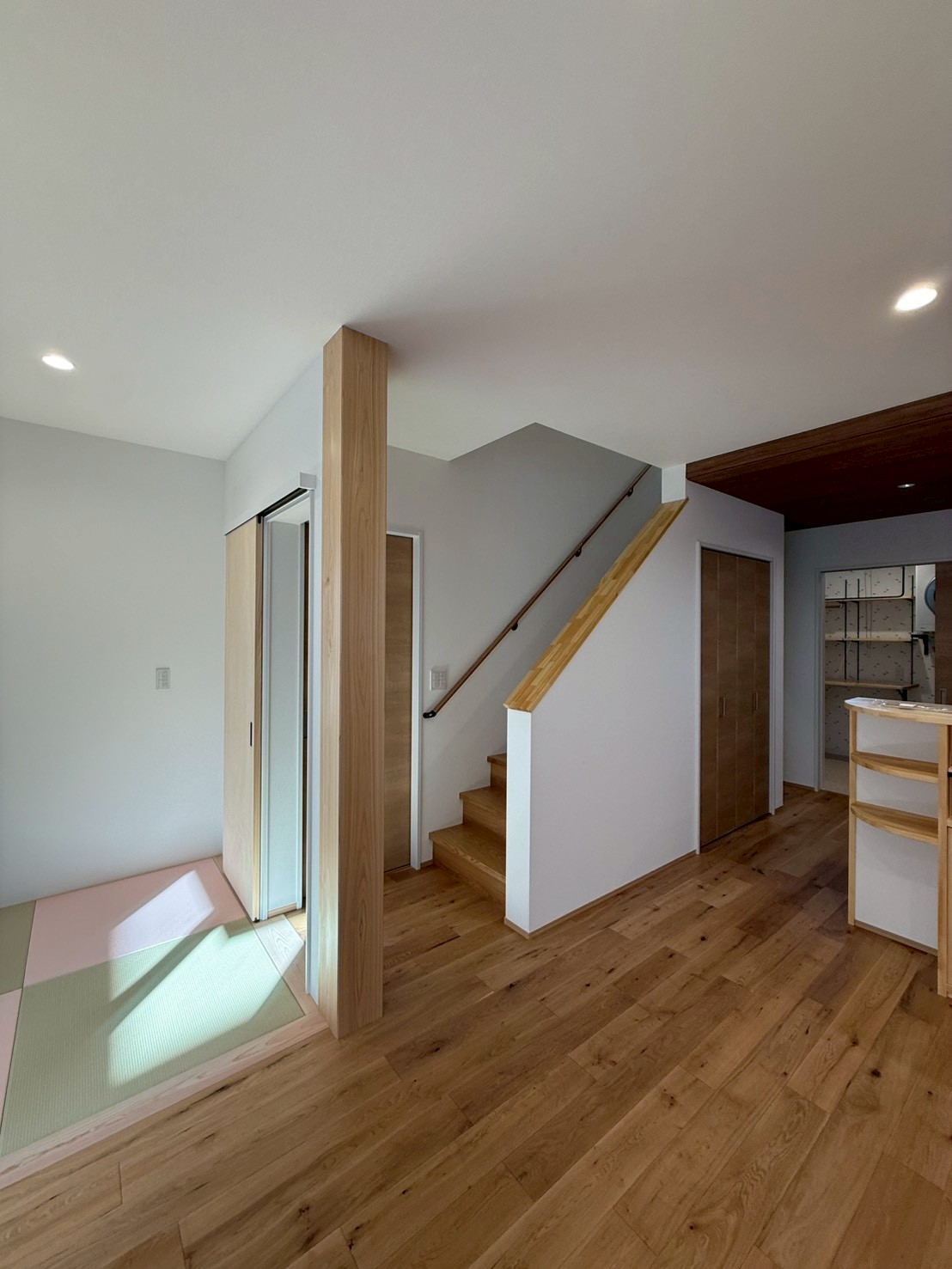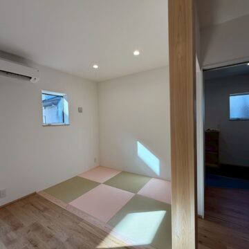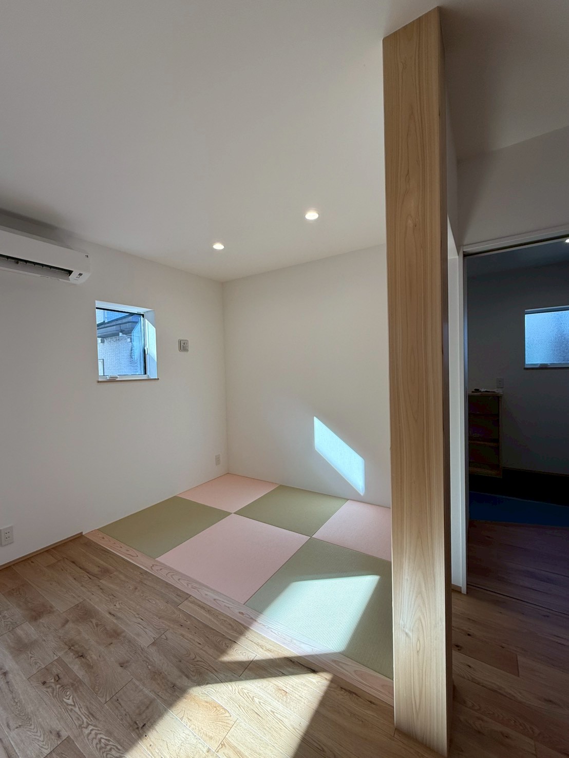 リビングの一角には、緑とピンクの桜餅カラーで組み合わせた可愛い畳スペースを設け、お子さまの遊び場や家族のくつろぎ空間として活躍します。家族の成長とともに長く愛される空間になりました。