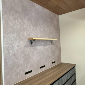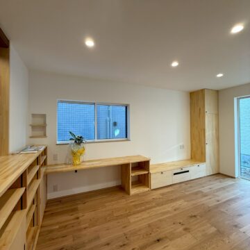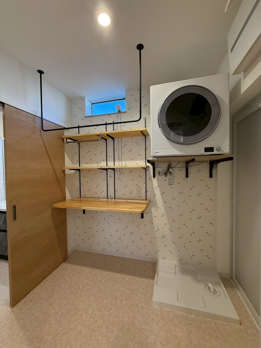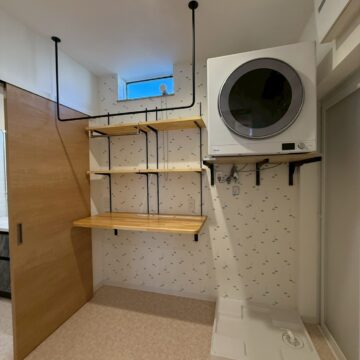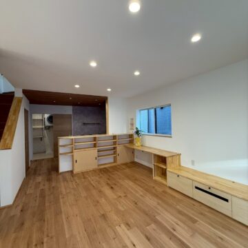 収納スペースは使いやすく整えられ、ランドリールームには作業台や棚を設けることで、家事動線にも配慮しました。落ち着いたデザインのカウンタースペースを設けることで、家事や在宅ワーク、ちょっとした作業にも便利な空間に仕上がっています。見た目にもこだわり、毎日の使いやすさまで丁寧に考えた住まいは、記念住宅ならではの家づくり。高知の気候や暮らしに寄り添いながら、ご家族にとって心地よいワクワクする住まいに仕上がりました。