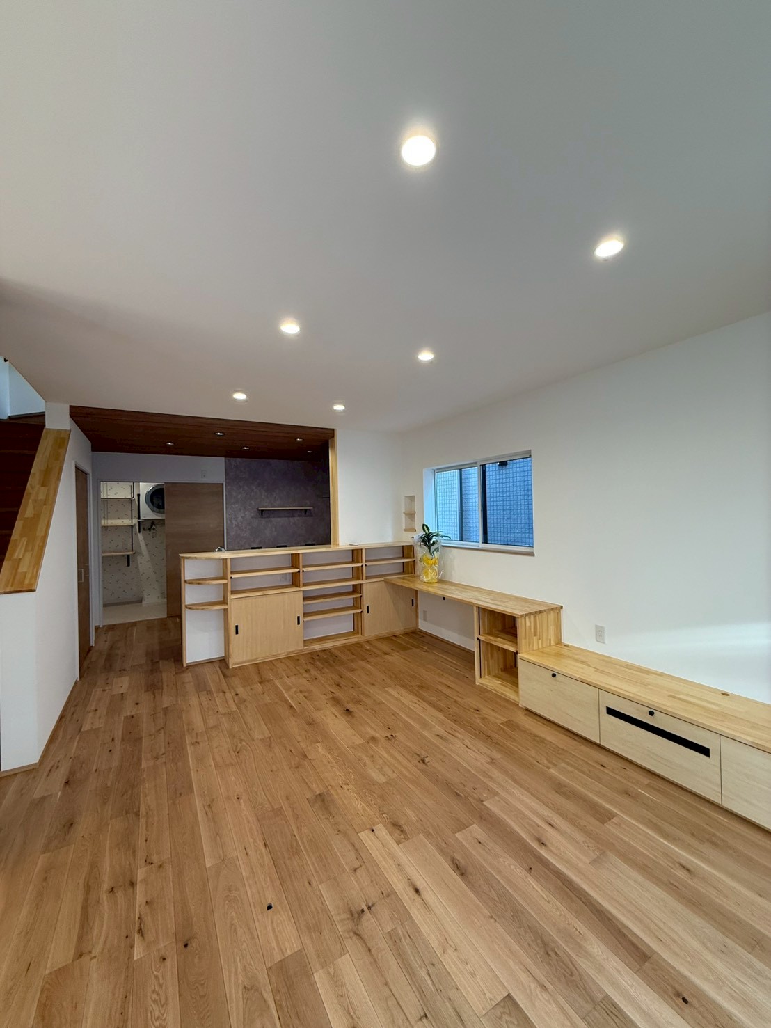 「き」の温もりをたっぷり感じられる、広々としたリビング。床や収納棚にはふんだんに「き」を使用し、大工さんの手作りによる収納を随所に設けることで、使いやすさと温かみを活かした造りにしました。