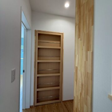 一見すると収納棚に見える、2階廊下の突き当たり。その扉の奥には、約3畳の書斎スペースが隠されています。まるで秘密基地のような隠し扉のある家は、遊び心と実用性を兼ね備えた住まいならではの工夫。在宅ワークや読書、趣味の時間に集中できる落ち着いた空間として活躍します。