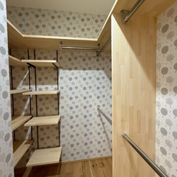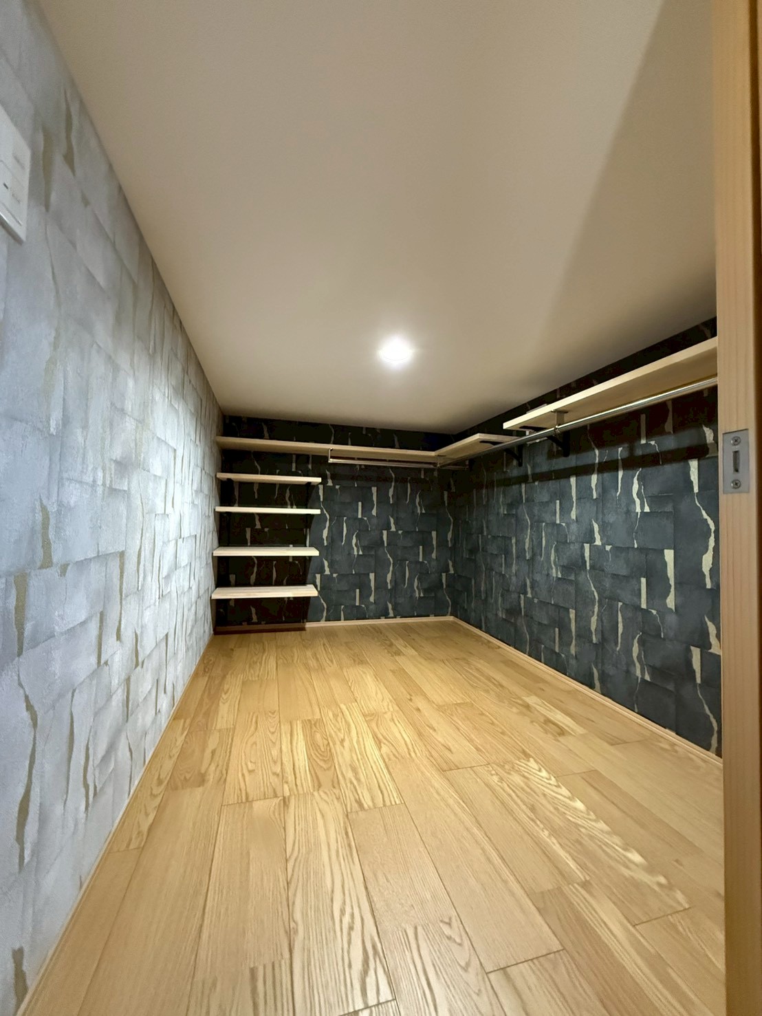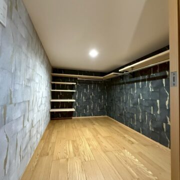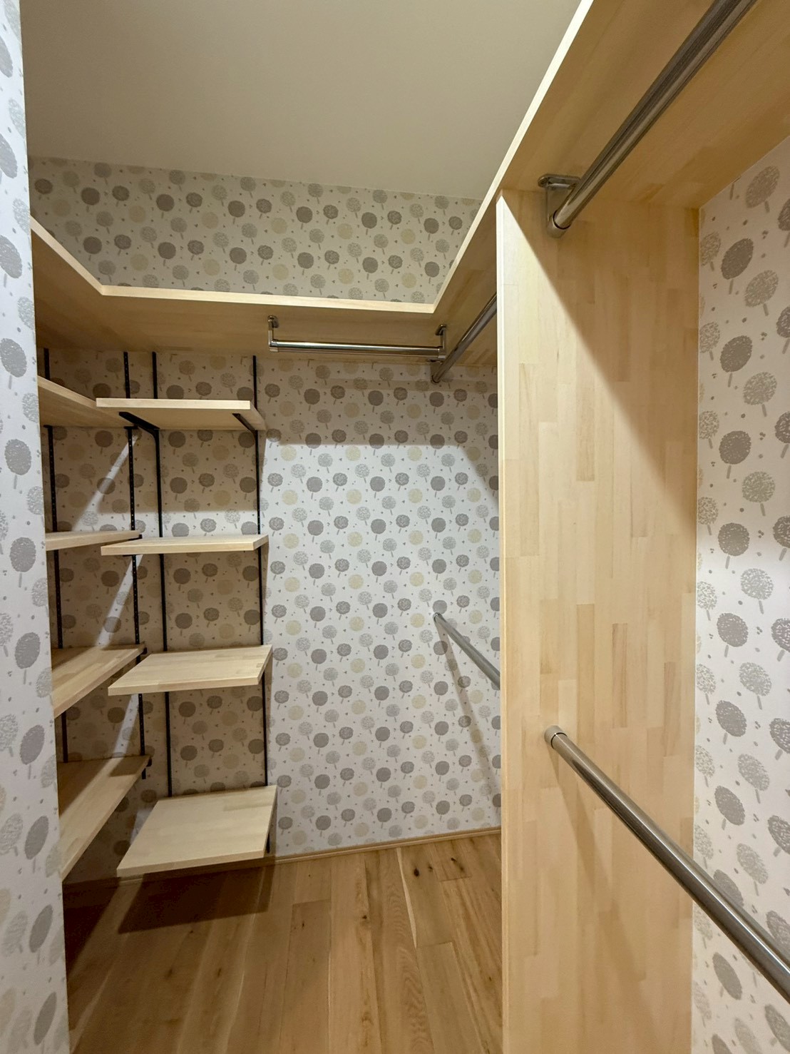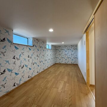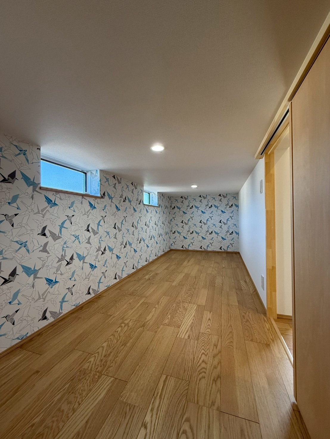 木のあたたかみを感じる床材と、遊び心のあるアクセントクロスを組み合わせることで、実用性とデザイン性を兼ね備えた屋根裏空間に仕上がりました。収納スペースとしてはもちろん、趣味部屋やお子さまの遊び場など、暮らしに合わせて多目的に使えるのも魅力です。