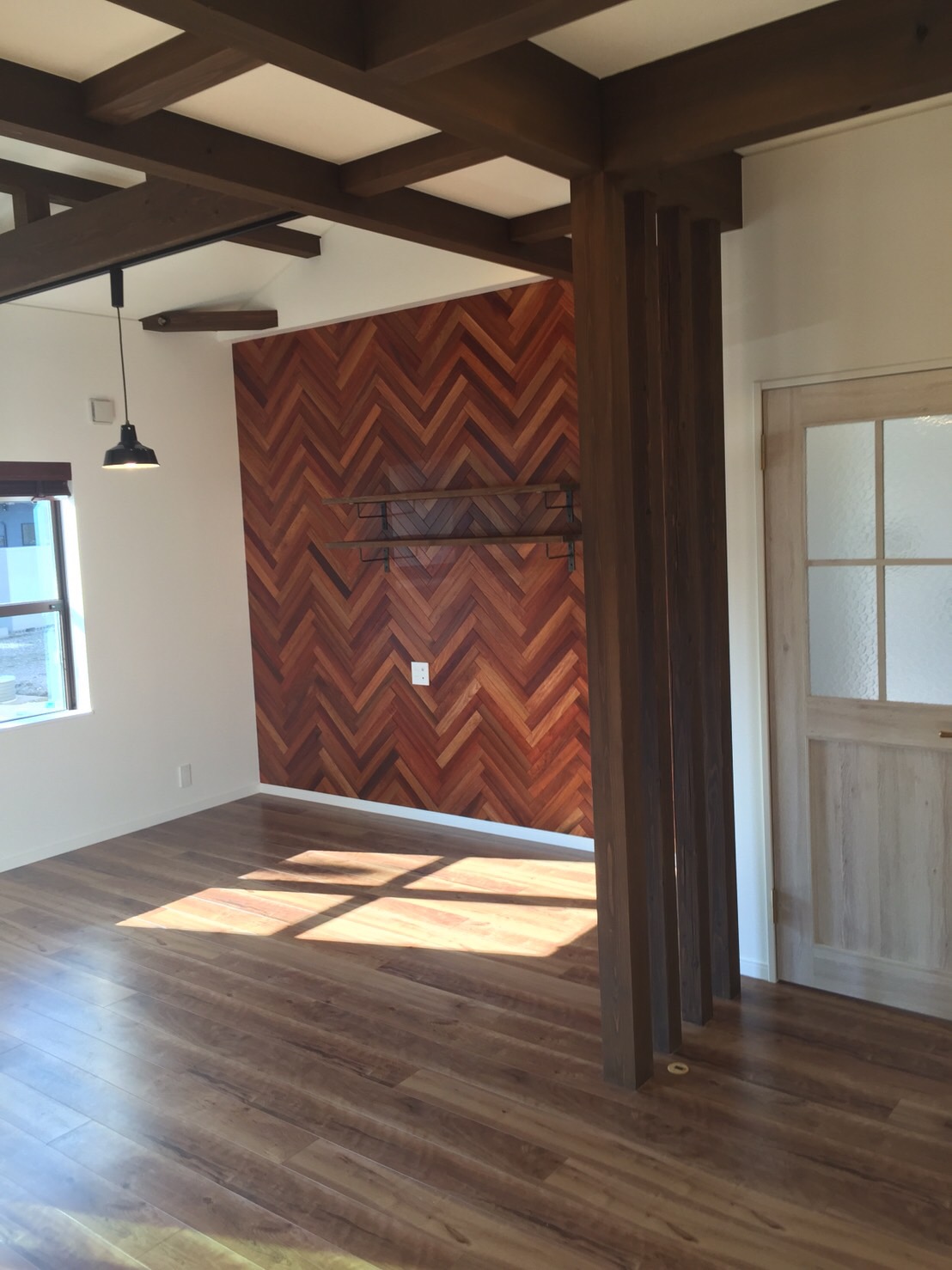 リビングの壁一面は大工さん力作の「ヘリンボーン」で仕上げました。